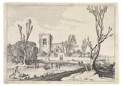 Winter scene: Skaters before a church and a village