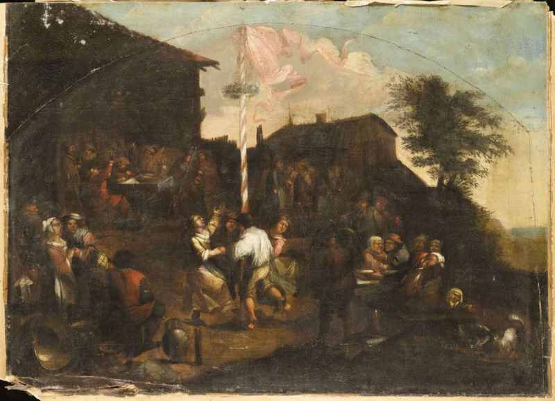 | A VILLAGE FETE WITH FIGURES OUTSIDE A TAVERN MERRYMAKING AND DANCING ROUND A MAYPOLE | |