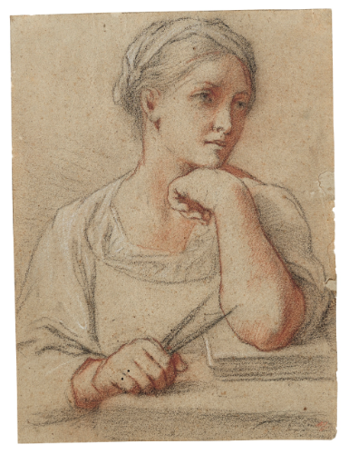 | STUDY OF A YOUNG WOMAN, HER ARM RESTING ON A BOOK, HOLDING A COMPASS IN HER RIGHT HAND | |