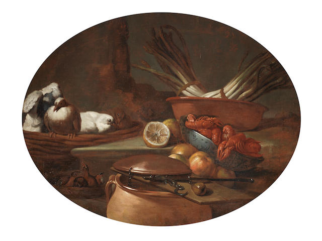 Doves, crayfish, a bowl of asparagus and a copper pot with various fruits
