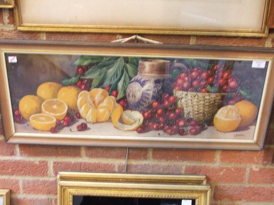 Still life, a stoneware jug, oranges, cherries, lemons and a basket upon a table covering