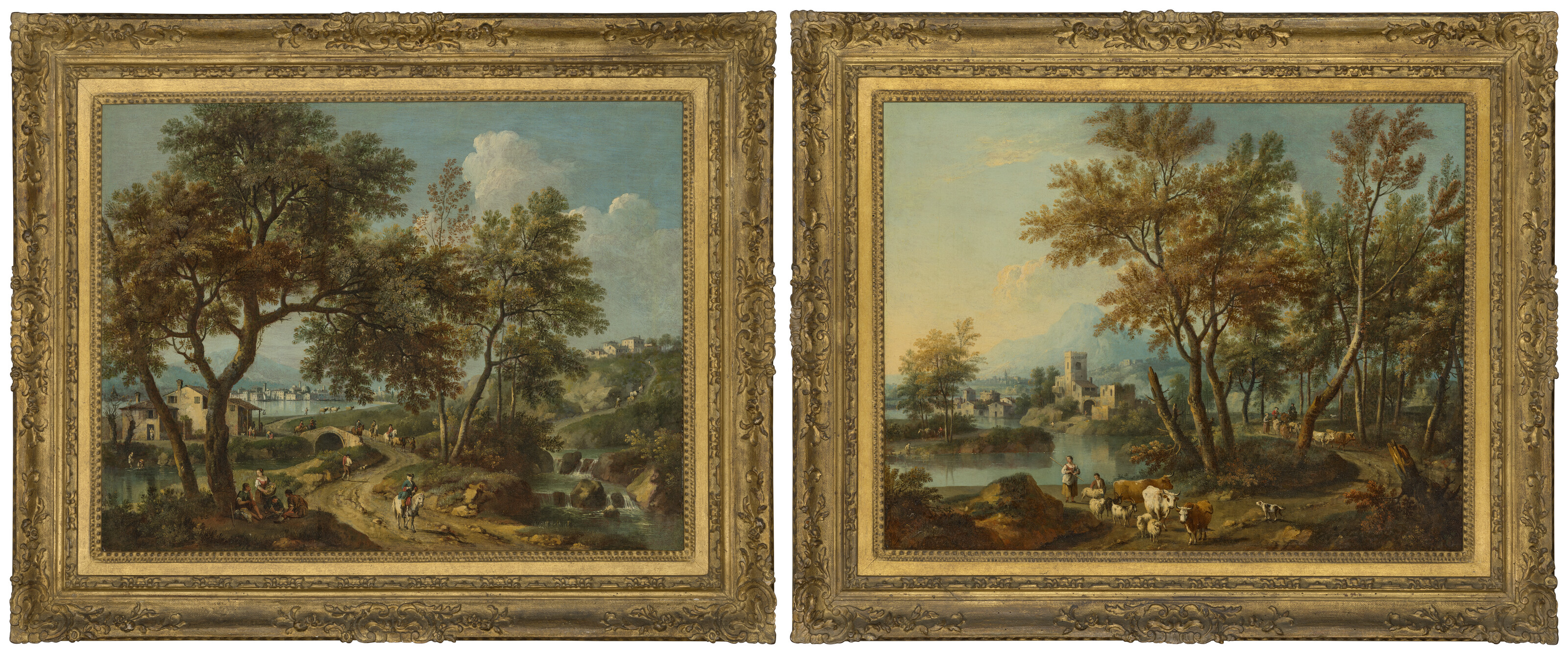 | An Italianate landscape with a view of Lake Garda and Salo in the distance with figures on a bridge; and An Italianate landscape with a view of Lake Garda with a shepherd and shepherdess watering their flock at a river | |