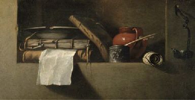 | Books, a plate, an earthenware pitcher, an ink well and quill in a niche with an oil lamp on the wall nearby | |
