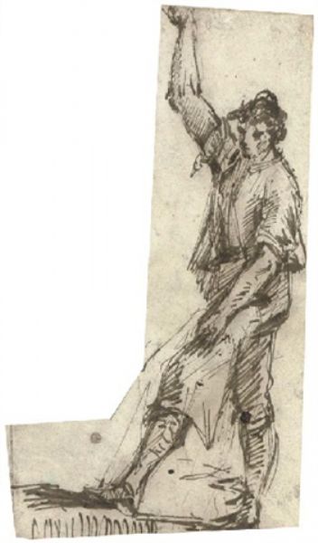 | A man in profile to the left, his right arm raised, his right arm resting on his thigh | |