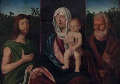 | Madonna mit Kind und Vögelchen, flankiert vom Hl. Johannes dem Täufer mit Spruchband (Ecce agnus dei qui tollis peccata) und dem | |