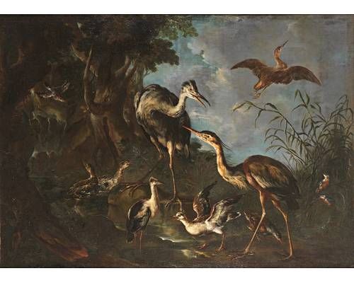 | A wooded landscape with heron, kingfishers, ducks and moorhens beside a pool | |