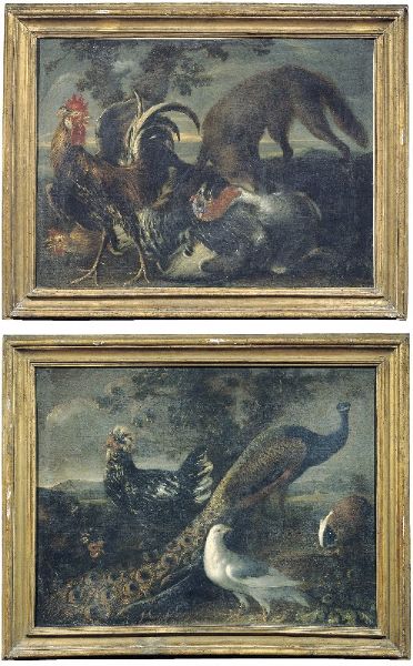 | Lotto unico di due dipinti: «Natura morta con uccelli e pavo- | |