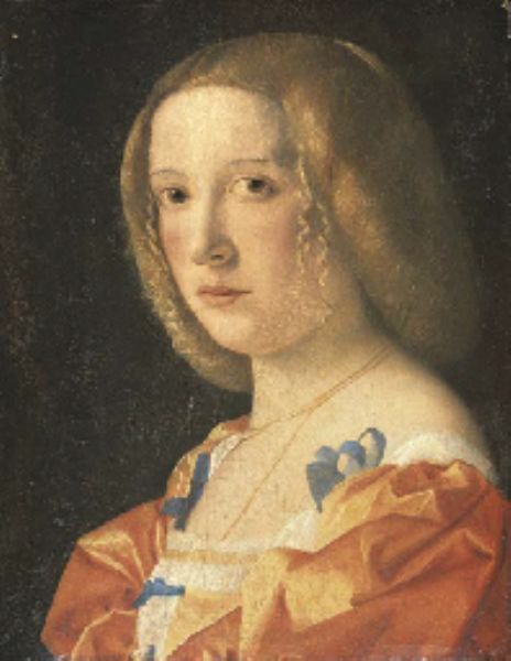 | Portrait of a young lady, bust-length, in a blue-bowed orange dress | |