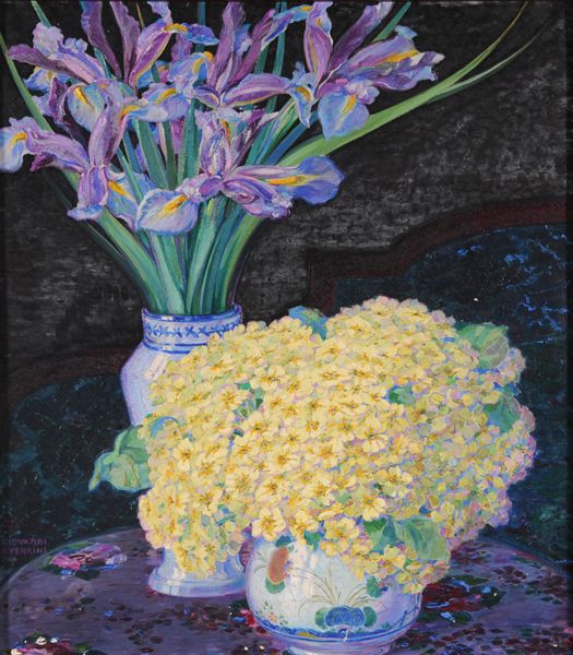 Natura morta con iris e ortensie