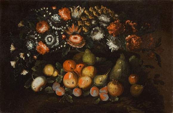 Nature morte de fleurs et de fruits.