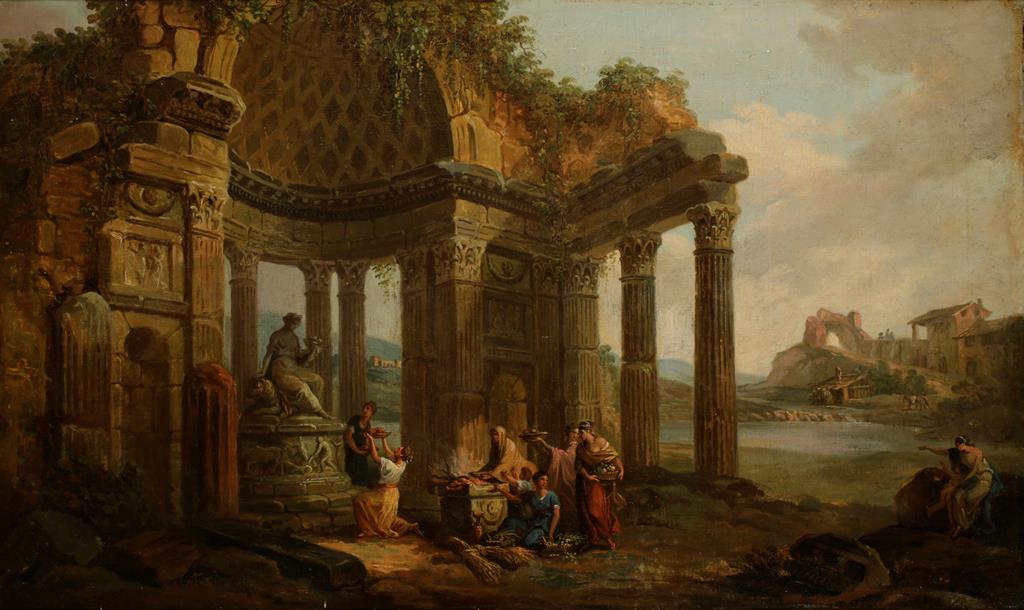 | An architectural capriccio with classical figures presenting offerings to a statue, probably of the Goddess Ceres | |
