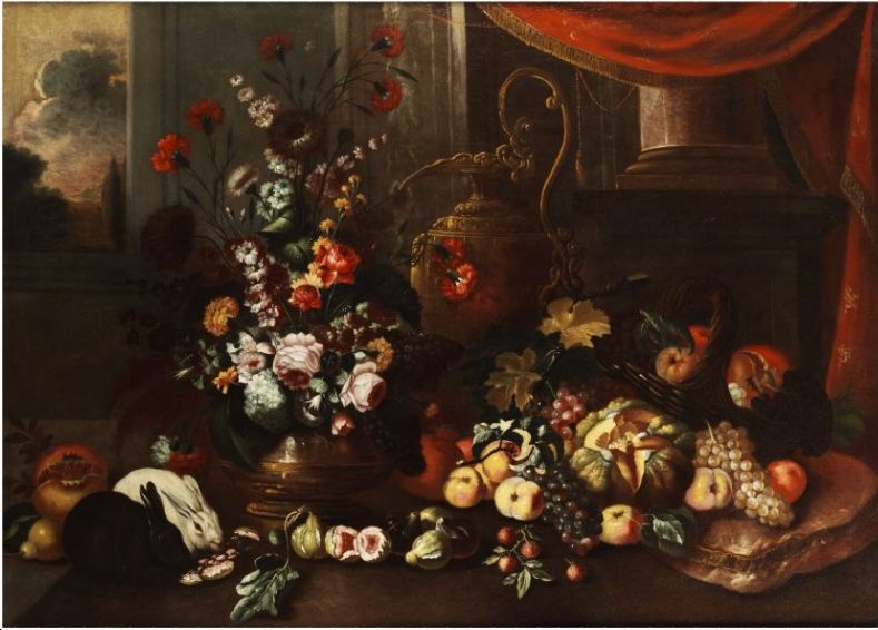 GROSSES BLUMEN- UND FRÜCHTESTILLEBEN MIT PRUNKGESCHIRR
