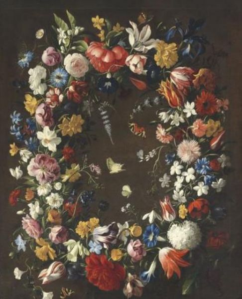 | Tulips, narcissi, jasmine, convolvulus, roses and other flowers in a garland with Jersey Tiger moths, a Swallowtail and various | |