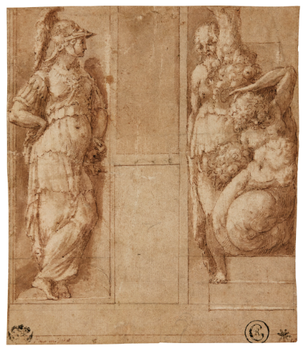 | DESIGN FOR A DECORATIVE SCHEME: A STANDING FEMALE FIGURE, POSSIBLY MINERVA; TWO BEARDED MEN, ONE POSSIBLY MARSYAS | |