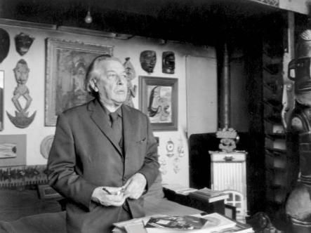 Andre Breton entoure de sa collection d'art primitif, rue Fontaine, Paris