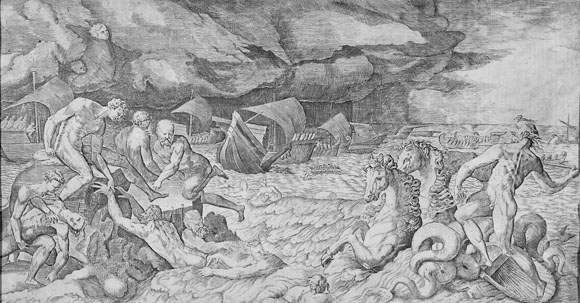 Neptun besänftigt die Wogen vor der Flotte des Aeneas.