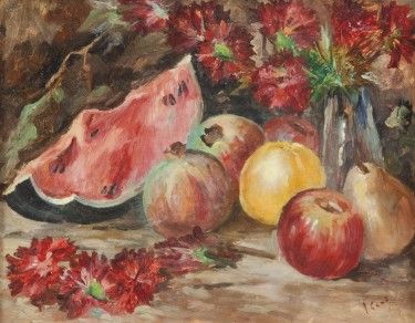 Anguria, pere e melograni su un piano con un vaso di fiori