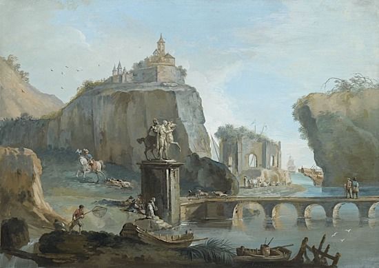 Paysage animé de ruines et de différents personnages