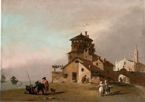 | VEDUTA DI CITTÀ CON CHIESA ED EDIFICIO TURRITO, CON FIGURE E IMBARCAZIONI FUORI DALLE MURA | |