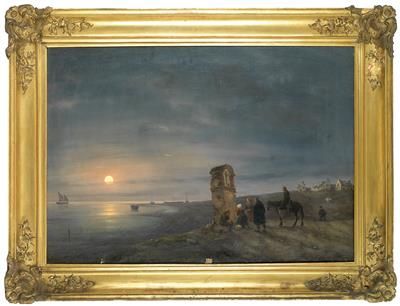 Küstenlandschaft bei Mondschein mit Figuren vor einem Bildstock
