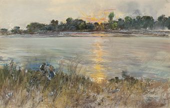 A gathering on the riverbank at dusk
