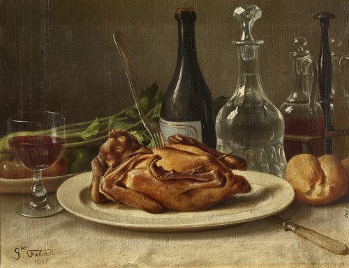 Stillleben mit Geflügelbraten, Semmel und Wein