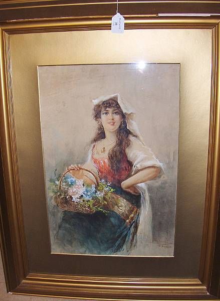 Portrait of a young girl, seated with a basket of flowers