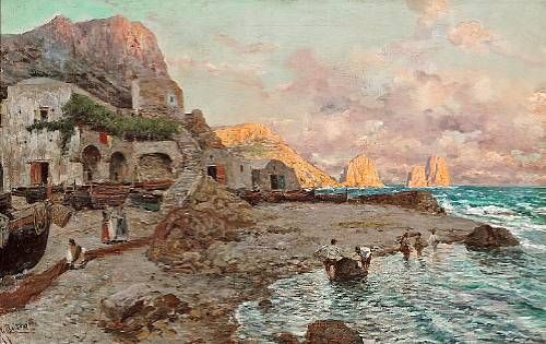 A view of the coast of Capri with figures on the beach and I Faraglioni beyond