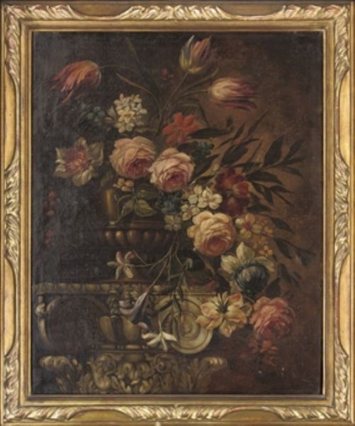 | Parrot tulips, roses and morning glory in a vase on a plinth; and Chrysanthemum, parrot tulip, roses and hydrangea in a vase on | |