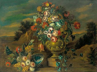 | Flowers in a stone vase and a porcelain bowl in a landscape | |