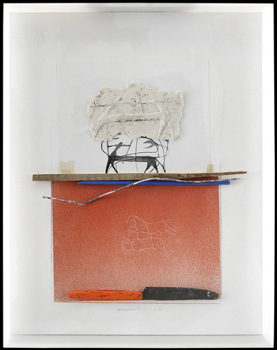 tecnica mista e collage su tavola 45x35x2,5 cm, firma e anno in basso al centro, opera registrata presso l'archivio Giuseppe Maraniello come da certificazione d'autenticità (duplicato) allegata, entro teca in plexiglass. | |