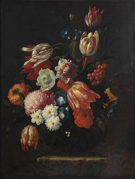 Tulips, roses, narcissi and other flowers in a glass vase on a stone pedestal