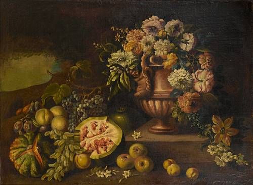 | Chrysanthemums, roses, orange blossom and other flowers in an urn, melons, apples, peaches and grapes before a stone ledge, a vi | |
