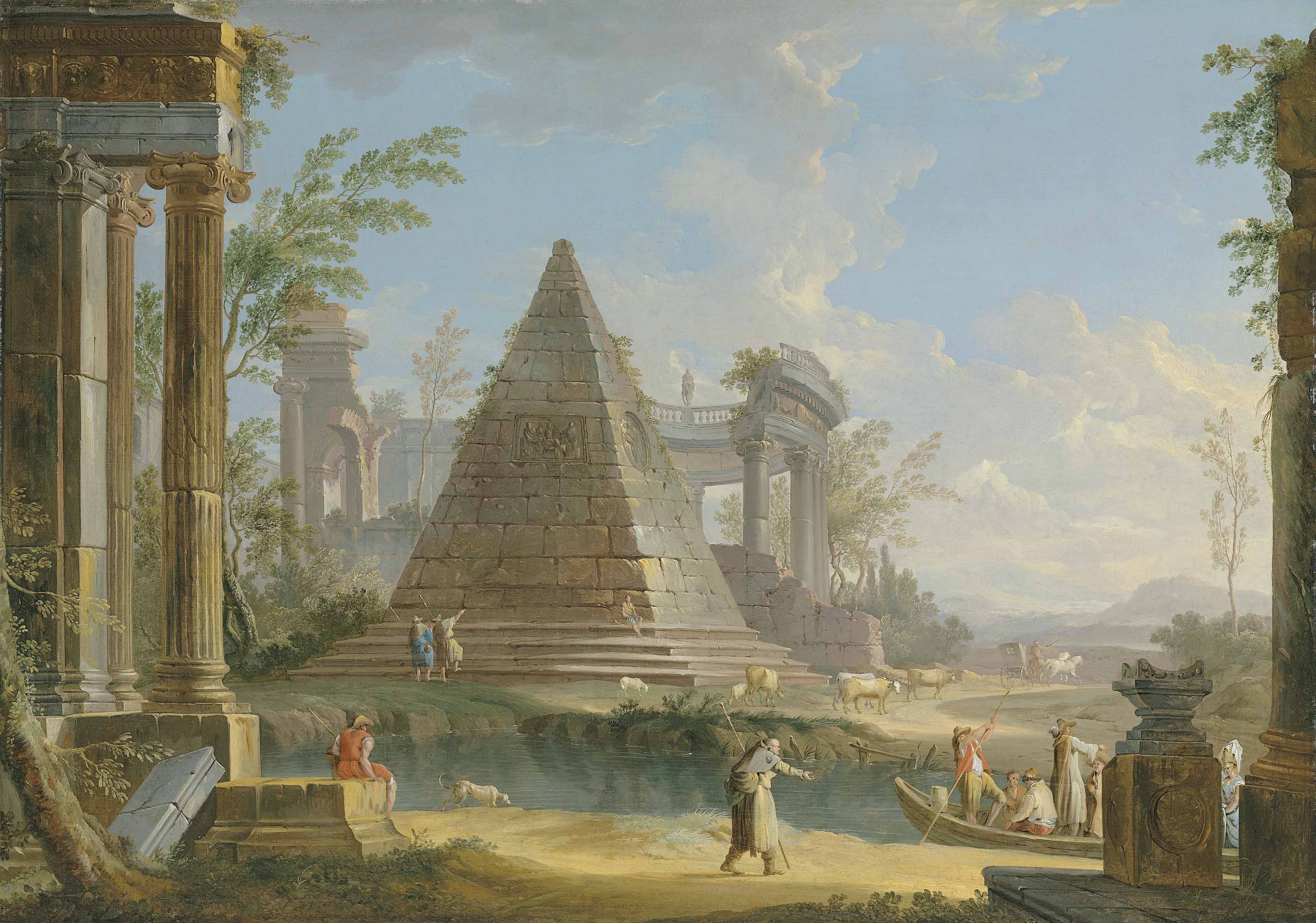 | An architectural capriccio with figures ferried along a river, an extensive landscape beyond | |