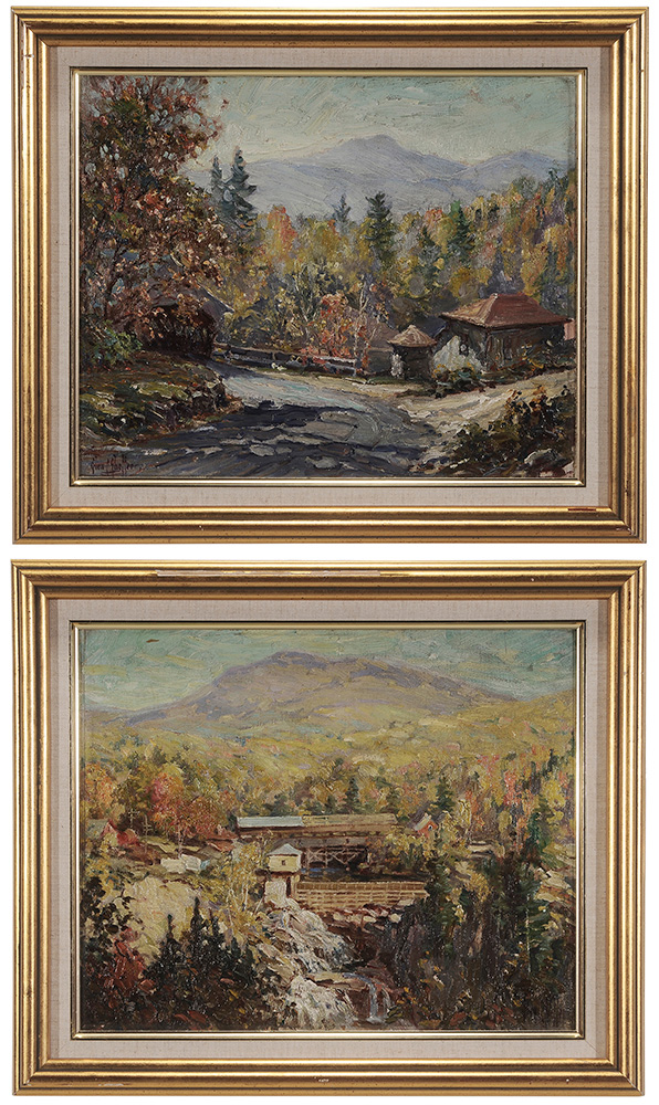 A pair of autumn landscapes with covered bridges