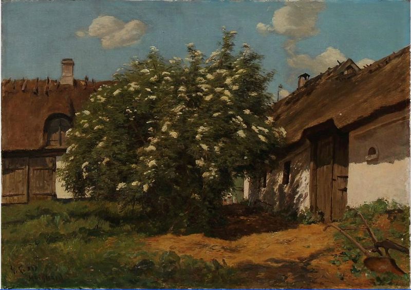 Farm yard with blooming elderberry.