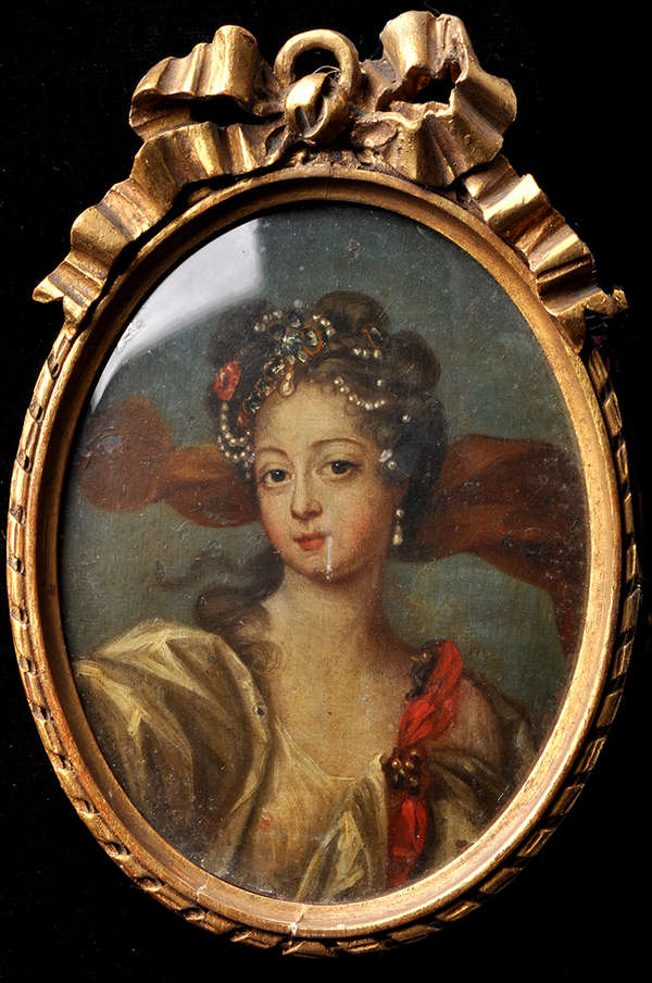 | A miniature portrait of a noble lady wearing a white dress with red shawl, hair decorated with pearls and precious stones | |