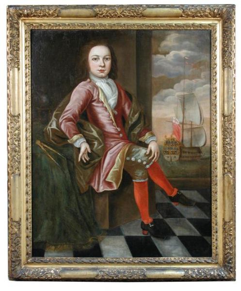 | An historical portrait of the young Sir Peter Pett, Master Shipwright to Elizabeth I, with HMS Pelican (later the Golden Hind) b | |