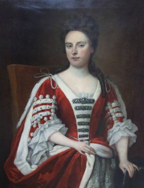 | Portrait of a titled lady wearing crimson velvet and ermine trimmed robes, three quarter length seated | |