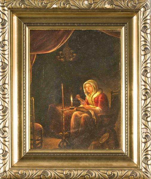 dunkles Interieur mit junger Näherin im Schein einer Kerze