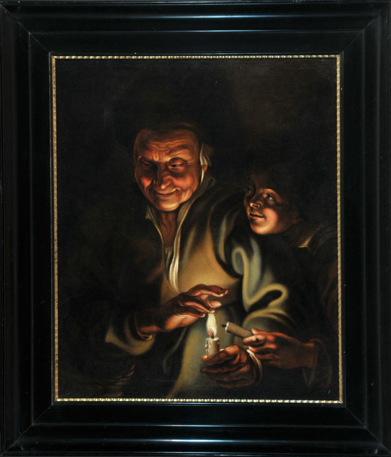 Herr mit Pelzkappe und Knabe mit Kerzen bei Nacht