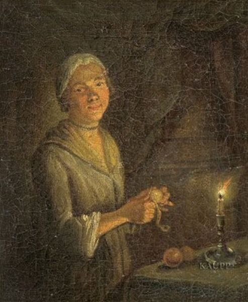Im Schein einer Kerze Äpfel schälendes Mädchen.