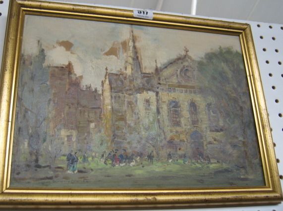 Figures outside a church