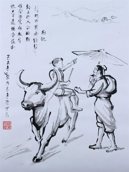 YOUTH ON BUFFALO BACK AND MAN WITH PARASOL