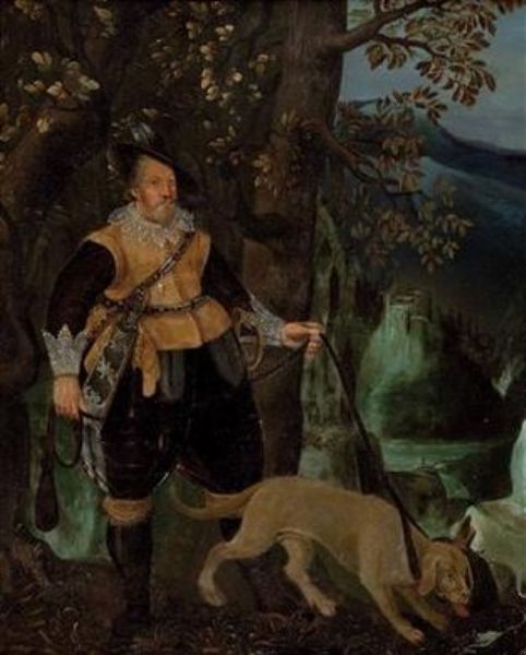 Schloßherr mit Jagdhund vor Landschaft