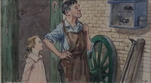 | Father and daughter, children raking hay and boys watching sheep shearing | |