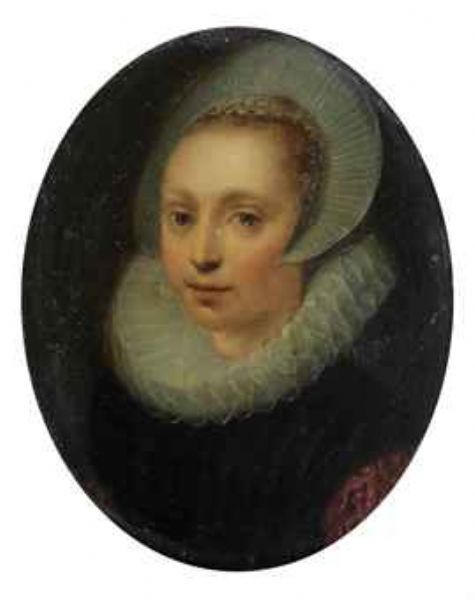| Portrait of a lady, bust-length, in a black and red dress with a white ruff and a lace cap | |
