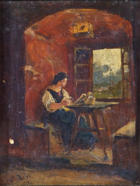 Traditionell gekleidete Bäuerin beim Nähen in einer Südtiroler Stube.