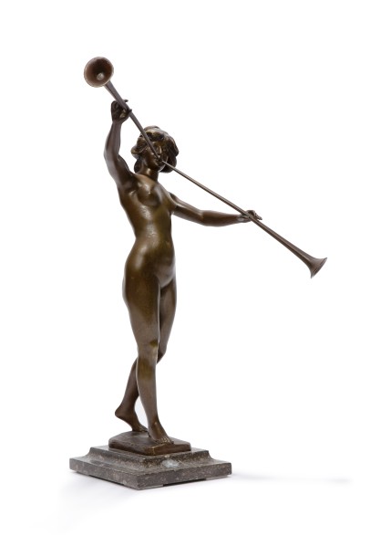 | Bronze with brown patina representing a woman playing salpinx | |