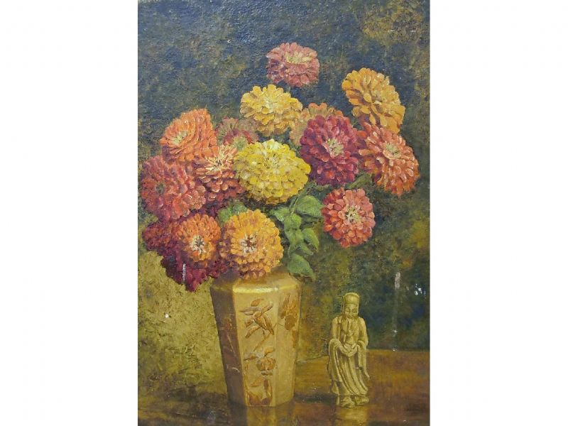 | still life of flowers within a Chinese vase and ivory carving of a sage | |